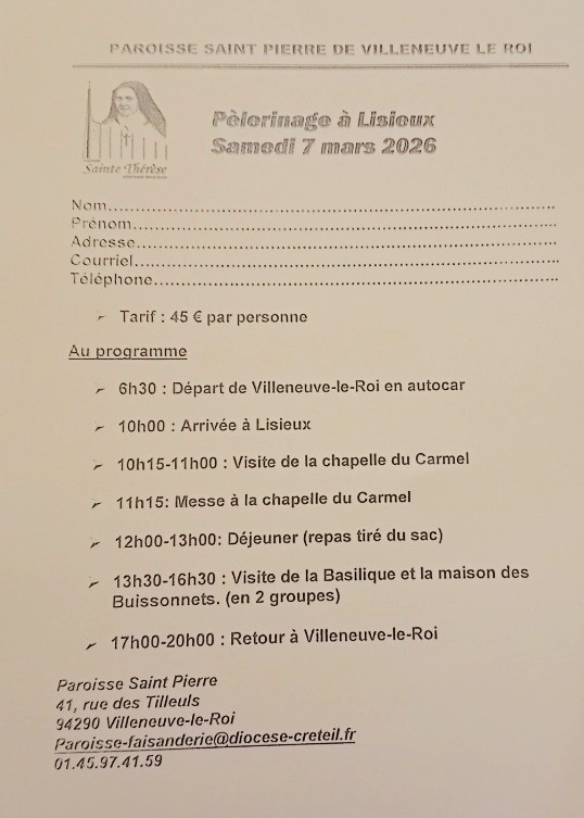 Paroisse Saint-Louis Feuille d’information – Février 2026 – Saint Louis 3 février 2026 Paroisse Choisy Feuille d’information, Paroisse Saint-Louis 2026 Février Information St LouisTélécharger La paroisse Saint-Pierre de Villeneuve-le-Roi organise un pèlerinage à Lisieux le 07 mars 2026.Des bulletins d’inscription sont à votre disposition a l’entrée de l’église ou ci-dessous. La date limite d’inscription est au 09 février 2026. Formulaire pour le pèlerinage à Lisieux organisé par la paroisse de Villeneuve-le-RoiTélécharger