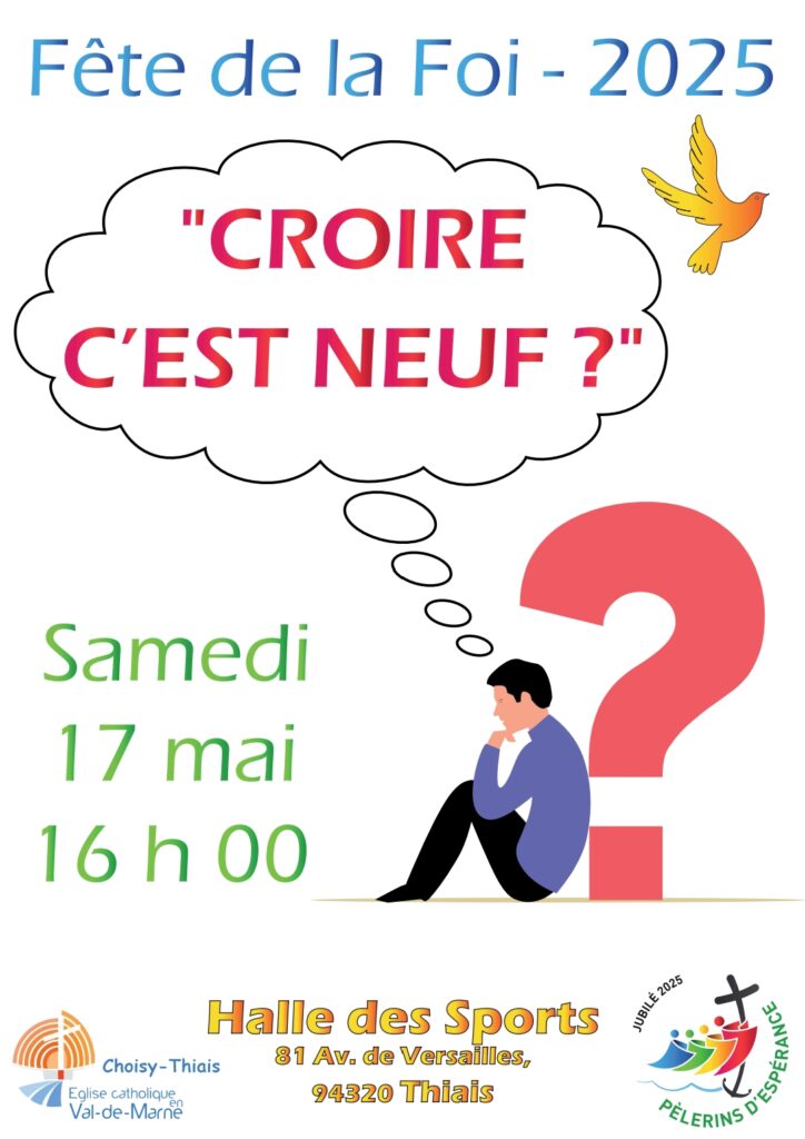 Doyenné Fête de la Foi ce samedi en doyenné Choisy/Thiais_ « Croire c’est neuf ? » 17 mai 2025 16:00 Halle des sports 81 avenue de Versailles 94320 Thiais S'y rendre Retour sur la fête de la Foi 2024, c’est ICI. Retour sur la fête de la Foi 2023