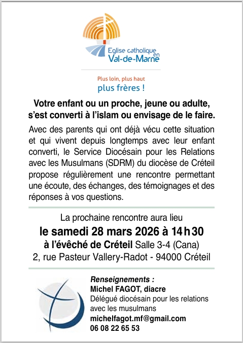 Samedi 28 mars, à 14h30 à l’évêché de Créteil le service pour les relations avec les musulmans propose une rencontre aux parents concernés par la conversion à l’islam de leurs proches.