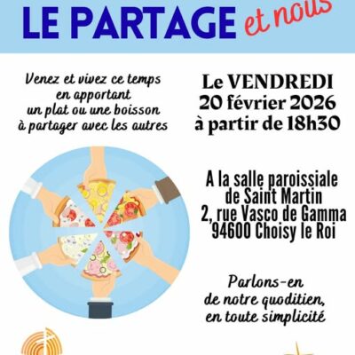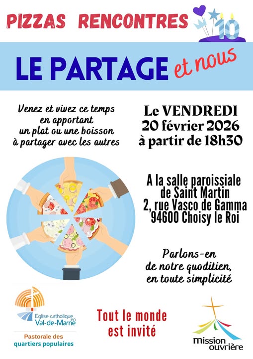 Doyenné Pizzas rencontre – Le partage et nous – Vous êtes tous conviés – 20 février 2026 18:30 Salle Paroissiale Saint Martin 2, rue Vasco de Gamma 94600 Choisy-le-Roi S'y rendre