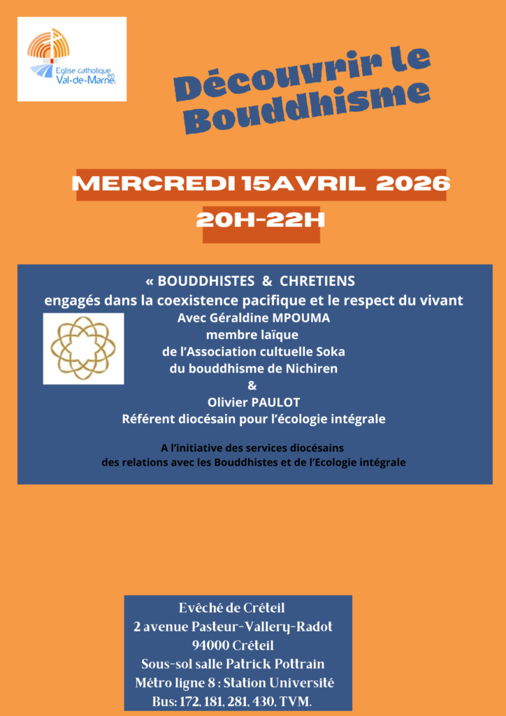Doyenné Soirée diocésaine de découverte du Bouddhisme à Créteil 15 avril 2026 20:00 – 22:00 Evéché de Créteil 2 avenue Vallery-Radot 94000 Créteil S'y rendre Une soirée pour découvrir un visage du Bouddhisme original et faire dialoguer les spiritualités. A ne pas manquer, si vous êtes disponibles.