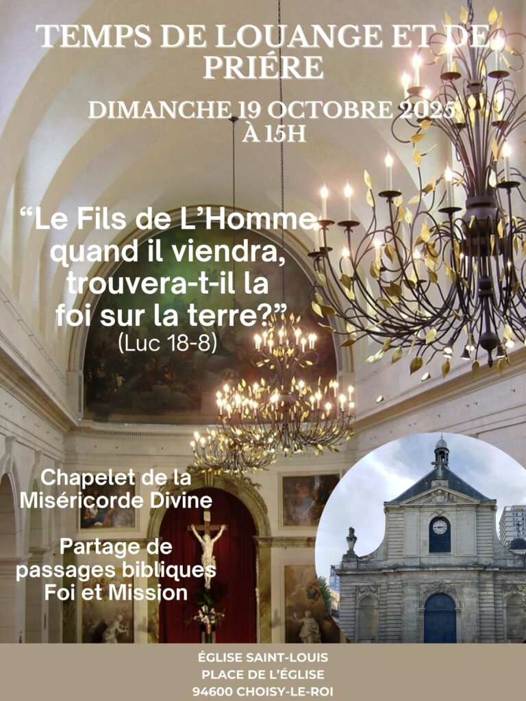Paroisse Saint-Louis Temps de louange et de Prière 19 octobre 2025 15:00 Eglise Saint Louis Place de l’église 94600 Choisy-le-Roi S'y rendre Un temps de louange, de prière, de partage de passages biblique sur la “ Foi et la mission” aura lieu le à l’église Saint-Louis de Choisy-Le-Roi à 15h00.